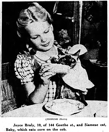 Joyce Braly, 10, of 144 Goethe st., and Siamese cat, Baby, which eats corn on the cob. (Chicago Tribune, Aug. 27, 1945)