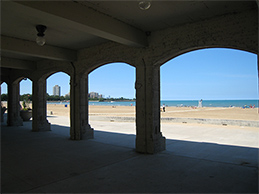 Jackson Park: the beach house, beach, and the park in a satellite view. The walk between the streetcar and the beach was along the lower (south) portion of the park, along 63rd St.; the beach is at the lower right.
