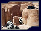The pandas, having arrived on the bank, are allowed to walk with the camel rather than ride it. They are next, and the skunks just behind.